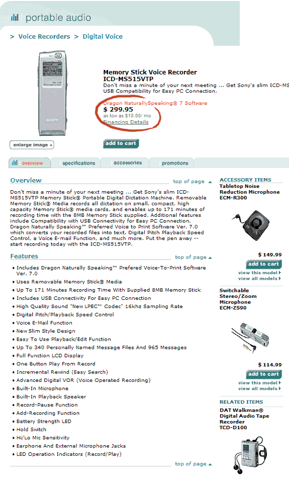 The difference is the Full Story. The second site gives me the whole enchilada. The first site simply sells me the basic specifications. And doubt grows in my mind. Sure I know the model is the same. But what if the one above doesn't have Dragon Naturally Speaking as part of it? Mmm…I really want it as part of the features.